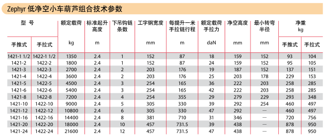它的額定載荷1500-24000公斤,Zephyr低凈空小車組合環(huán)鏈葫蘆專為對凈空高度要求極高的應用。低凈空葫蘆可以為特殊工字鋼定制,也可適用于各種軌道,標準工字鋼,寬型工字鋼等。此系列葫蘆綜合了Zephyr產(chǎn)品線重型級別部件的所有特性。